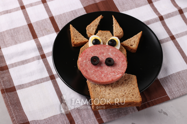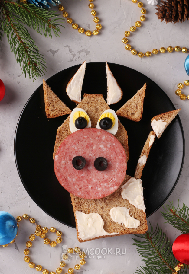 Подготовьте ингредиенты для бутерброда с колбасой и сыром в форме бычка.