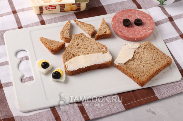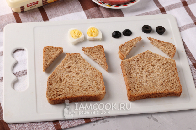Ломтики хлеба выложите на разделочную доску и отрежьте уголки, как показано на фото. Из одного ломтика будут уши, а из другого - рожки. Перепелиное яйцо разрезать на 2 половинки - это будут глаза. Из маслин будут зрачки и ноздри.