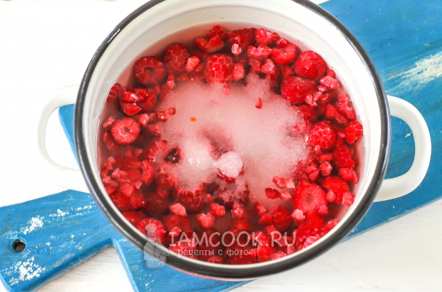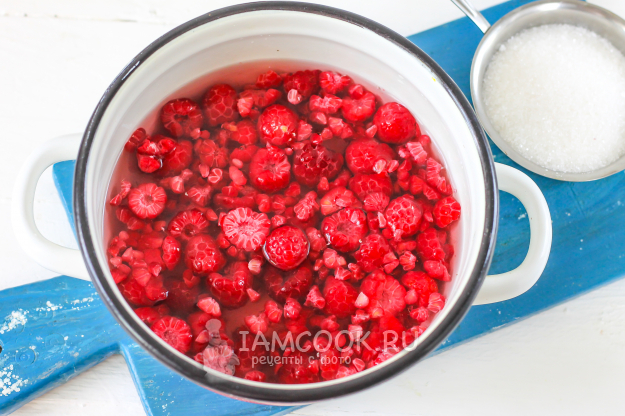 Если малина свежая, то сначала промойте ее, удаляя пыль и насекомых. Затем ягоды выложите в кастрюлю или ковш, сотейник, залейте теплой водой и поместите на плиту.