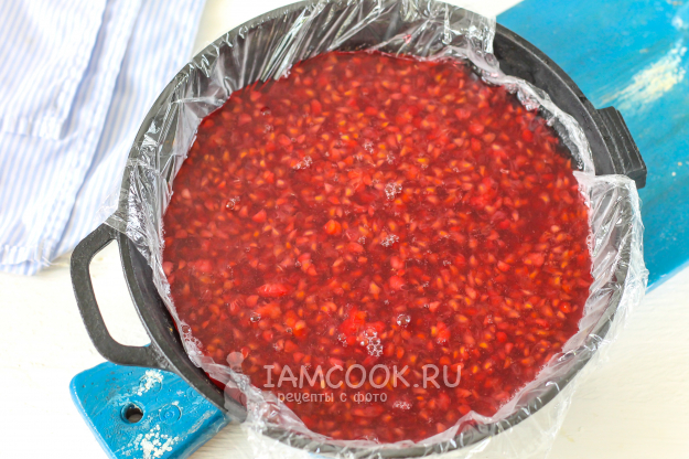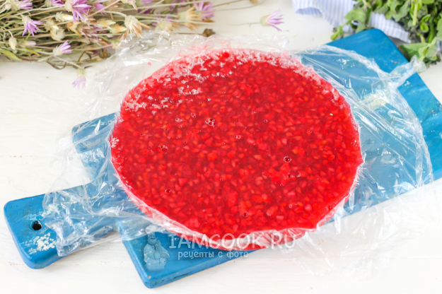 Снимите пищевую пленку и используйте компоте из малины по назначению или отправьте его на хранение обратно в морозильную камеру, обвернув пищевой пленкой.