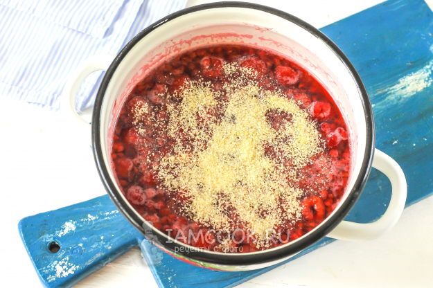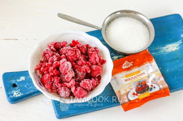 Подготовьте необходимые ингредиенты для малинового компоте для торта! Ягоды можно использовать как свежие, так и замороженные, к примеру - в зимнее время. Желатин допустимо заменить агар-агаром.
