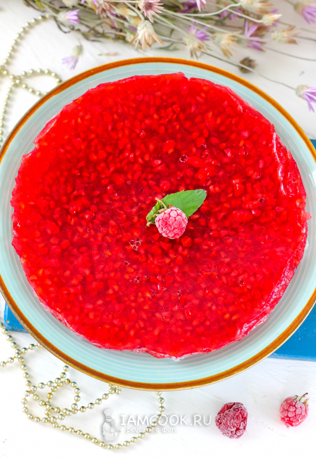 Спустя указанное время малиновое компоте для торта полностью застынет. Аккуратно извлеките его в пленке из формы.
