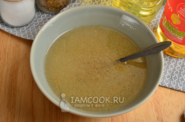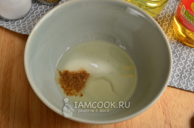 В другой миске смешайте ингредиенты для маринада - соль, сахар, кориандр, растительное масло и яблочный уксус.