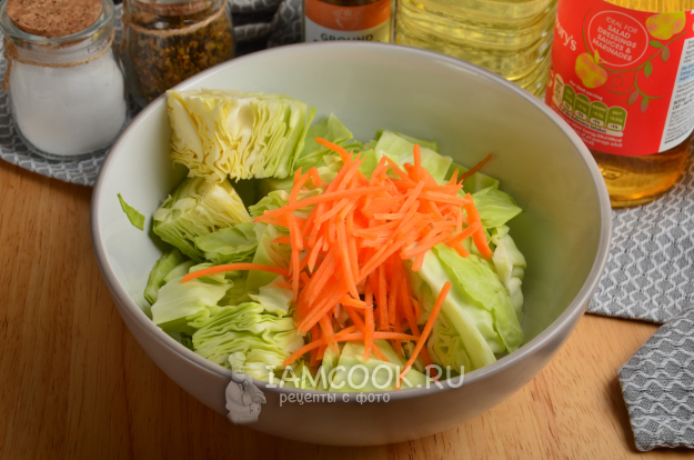 Морковь почистите и натрите на терке - на обычной или специальной, для корейских закусок. Положите в миску к капусте.
