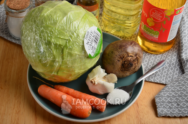 Подготовьте нужные продукты для приготовления вкусной пряной капусты со свеклой по-корейски на зиму.