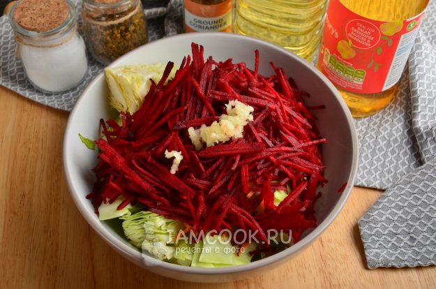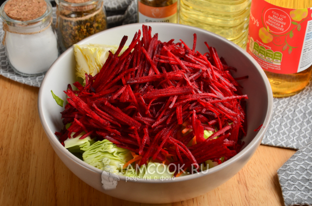 Почистите, помойте и натрите на той же самой терке и свеклу, положите в миску.