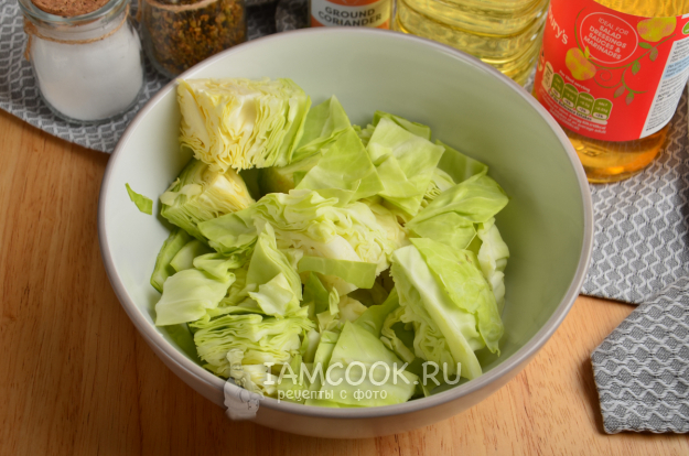 Белокочанную капусту помойте и нарежьте достаточно крупными кусочками, сложите в глубокую миску.