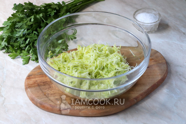 Кабачок натрите на средней терке, отожмите лишнюю жидкость, а стружку выложите в глубокую миску, удобную для замешивания теста.