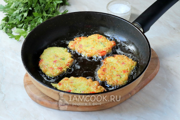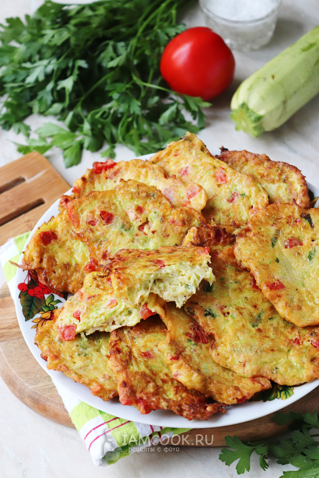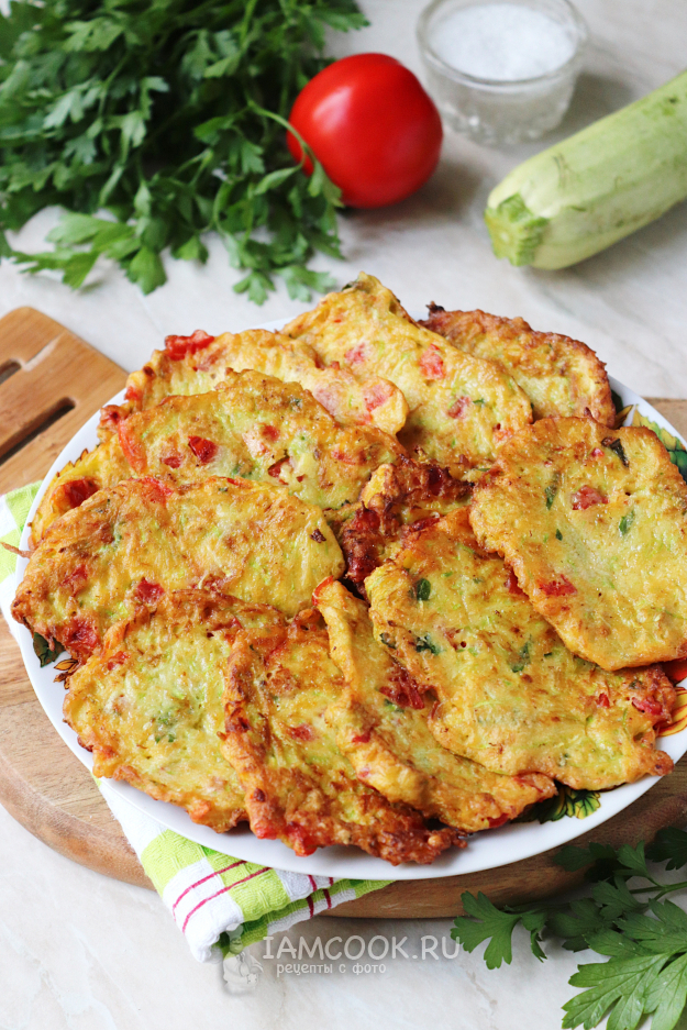 Вот такие красивые оладьи из кабачков с помидорами у нас получились.