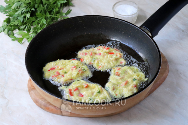 Столовой ложкой выложите порции теста на разогретую с растительным маслом сковороду, формируя круглые или овальные заготовки.