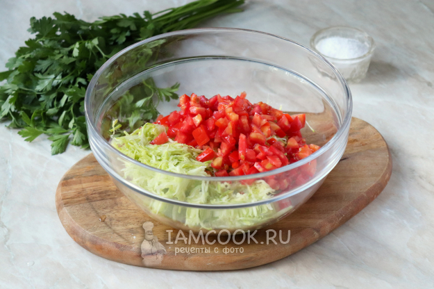 Добавьте мелко нарезанные помидоры. По желанию можете снять с них кожицу. Для этого сделайте на плодах крестообразный надрез, залейте на 1 минуту кипятком и сразу же переложите в ёмкость с холодной водой. Благодаря таким процедурам кожица легко снимется.