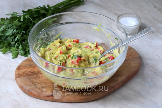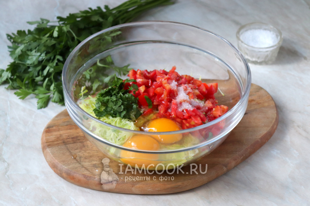 В миску с кабачками и помидорами вбейте куриные яйца, добавьте по вкусу соль и мелко нарезанную зелень. Перемешайте.