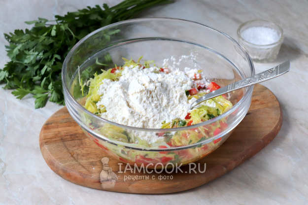 Снова интенсивно перемешайте, чтобы не было мучных комочков. Тесто на кабачковые оладьи должно получиться достаточно густым, практически без жидкости.
