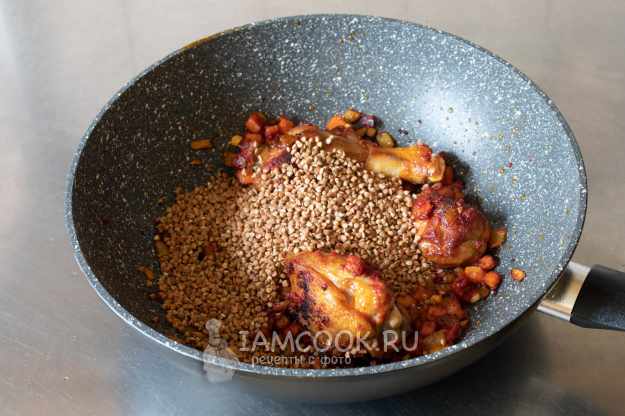 Всыпаем гречневую крупу, промешиваем - она должна покрыться ароматным жиром.