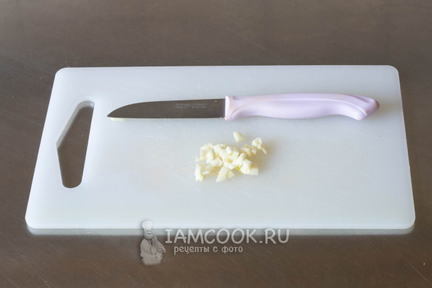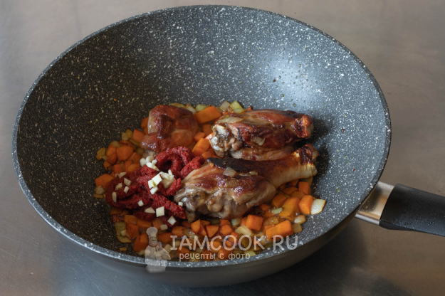 После того как лук станет прозрачным или зарумянится до золотистого и даже коричневого (кто как любит), добавляем чеснок и томатную пасту и жарим всё вместе буквально 30 секунд.