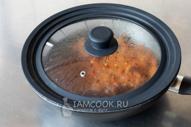 Добавляем воду, закрываем сковороду крышкой и варим всё на довольно слабом огне 20 минут (вплоть до выпаривания жидкости).