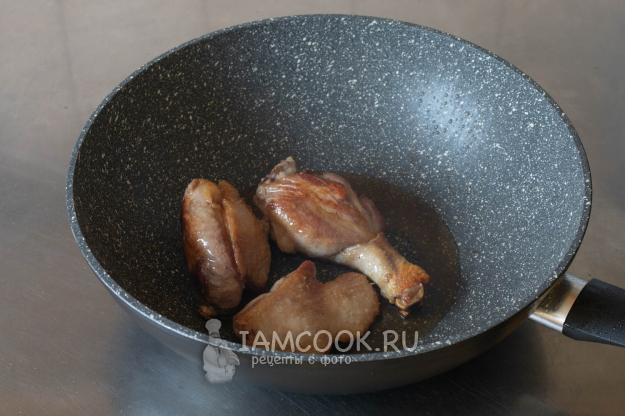 Обжариваем утку на раскалённой сковороде в очень небольшом количестве растительного масла (основной жир должна дать утка) до коричневой румяности со всех сторон.