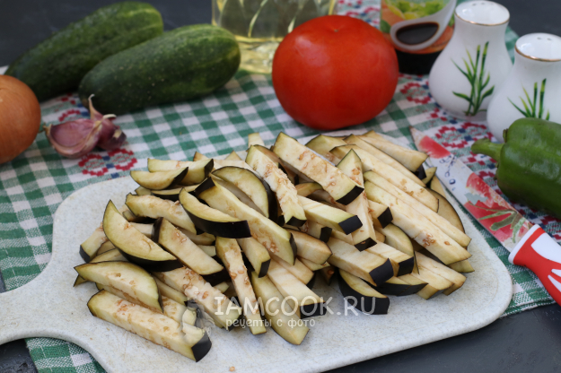 Баклажаны вымыть, удалить хвостики. Нарезать баклажаны соломкой толщиной 7-8 мм.