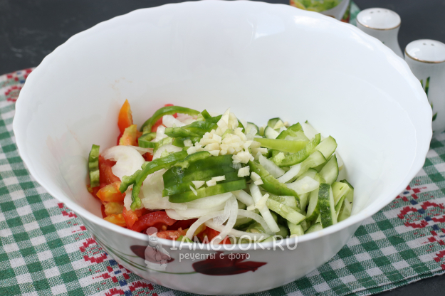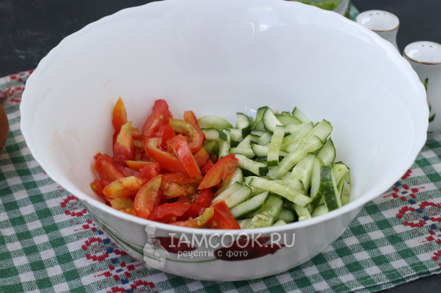 Вымыть другие овощи. Нарезать соломкой огурцы и помидоры, сложить в глубокий салатник.