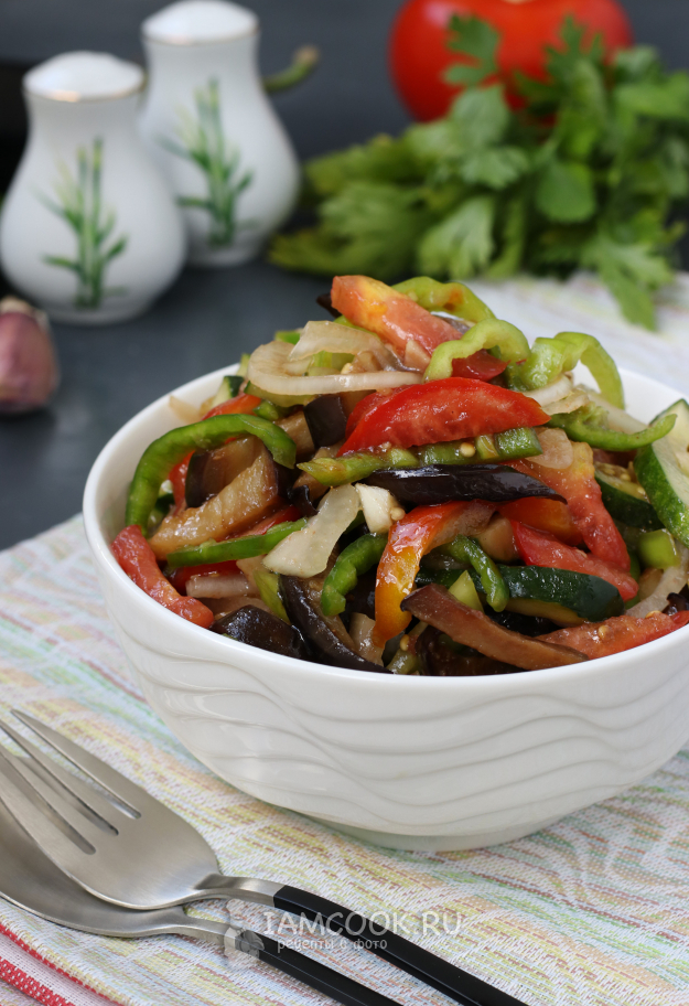 Для приготовления салата из баклажанов с помидорами и огурцами подготовить из списка необходимые ингредиенты.