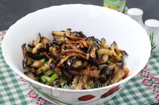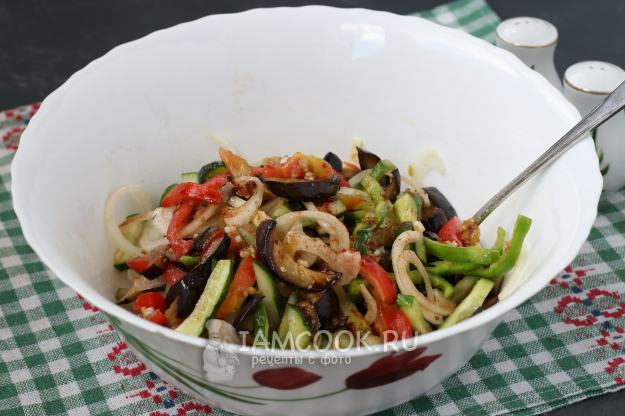 В салат добавить немного соли, молотый красный перец и соевый соус, перемешать. Салат из баклажанов с помидорами и огурцами готов.