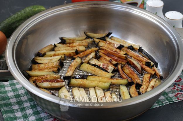 В сковороде разогреть подсолнечное масло и обжарить баклажаны до золотистой корочки. Жарить следует в один слой, чтобы все баклажаны прожарились. Во время обжаривания можно добавлять новую партию баклажанов. Баклажаны немного посолить.