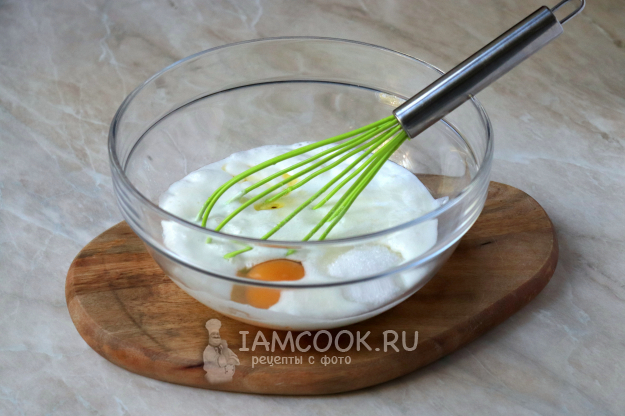 Затем добавьте сахарный песок, соль, куриное яйцо и растительное масло.