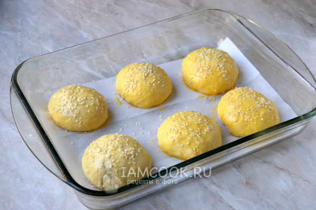 Выложите их в жаропрочную форму, застеленную пергаментом, на небольшом расстоянии друг от друга. Поверхность булочек смажьте взбитым яйцом и посыпьте кунжутом.