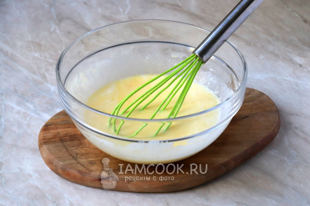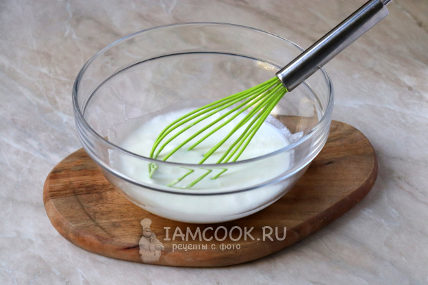 Простоквашу налейте в объемную миску и всыпьте разрыхлитель. Перемешайте. Жидкость спустя несколько секунд вспенится - это реакция между разрыхлителем и кисломолочным продуктом.