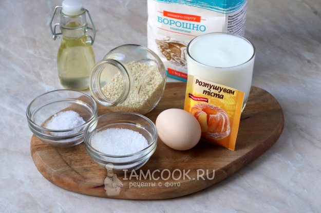 Для приготовления булочек на простокваше без дрожжей в духовке необходимы следующие ингредиенты. Все они должны быть комнатной температуры. Вместо кунжута можно использовать мак, семена льна и т.п.