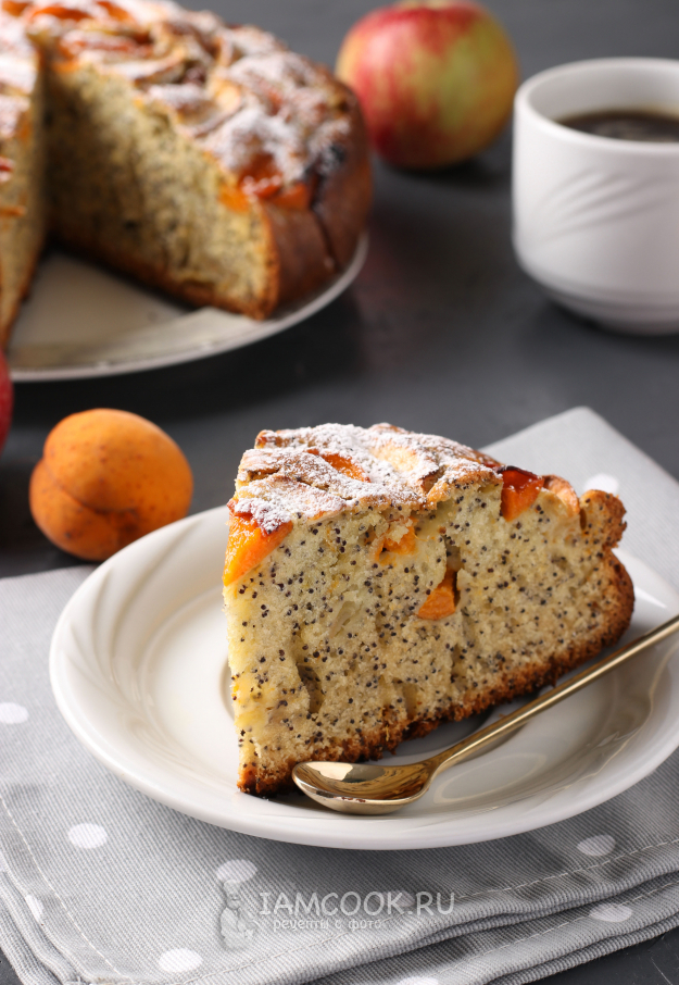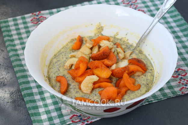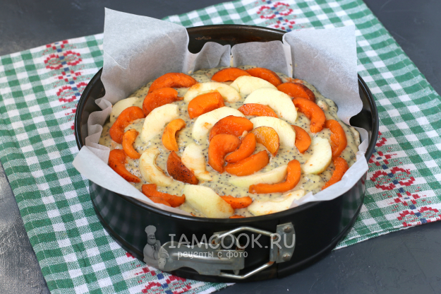 В тесто добавить мак, хорошо перемешать, затем добавить половину абрикосов и яблок.