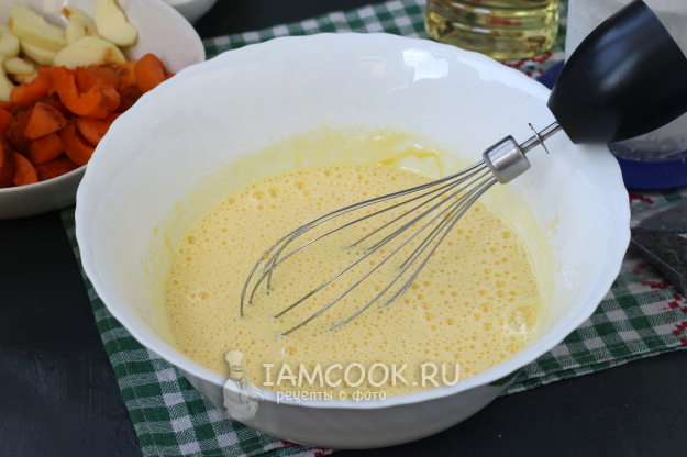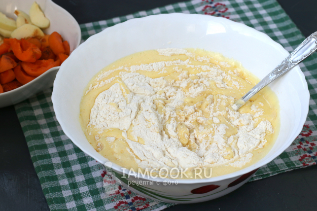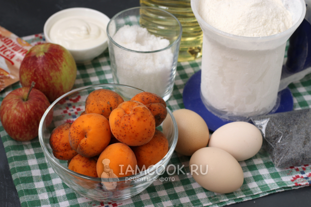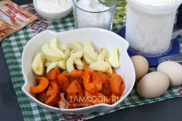 Возьмите ингредиенты для приготовления пирога с яблоками и абрикосами в духовке. Все продукты для пирога должны быть комнатной температуры.