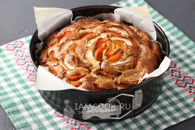 Духовку разогреть до 180 градусов и выпекать пирог с яблоками и абрикосами 40-45 минут. Готовность проверить при помощи деревянной шпажки, чтобы на ней не оставалось сырое тесто.