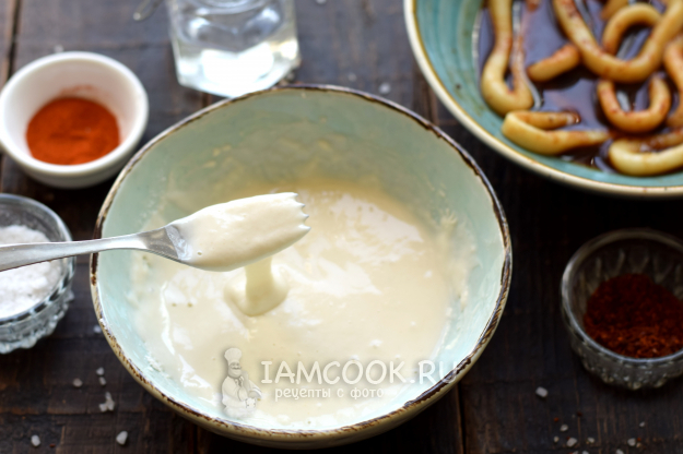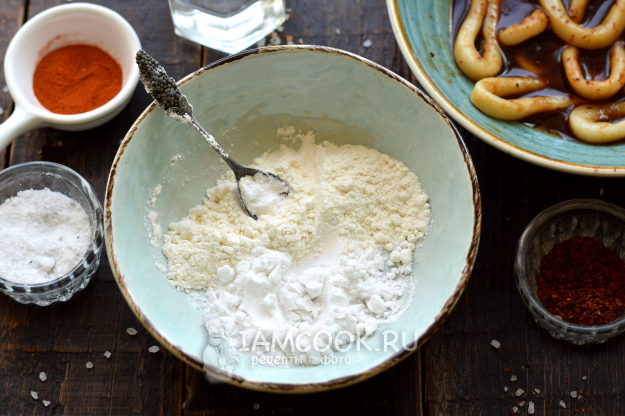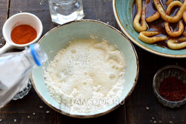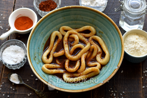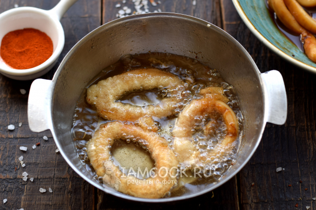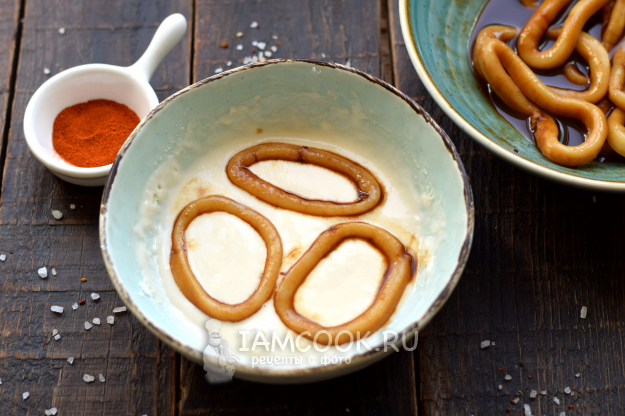 Спустя время промаринованные кольца кальмаров опустите в кляр, запанируйте со всех сторон.