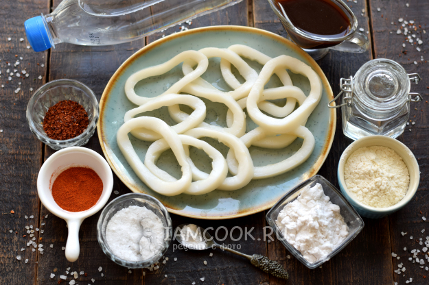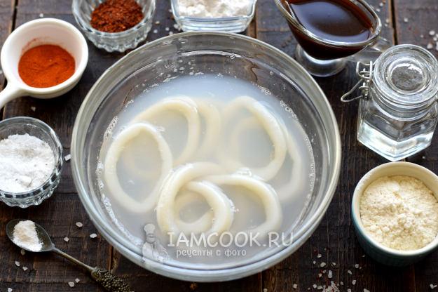 Подготовьте продукты для приготовления кальмаров в кляре по-китайски (кольцами). Для блюда можно использовать как целую тушку кальмара, так и уже очищенные кольца. Кольца кальмара заранее достаньте из морозильного отсека, чтобы они разморозились.