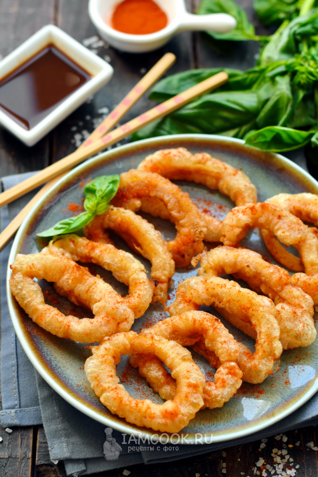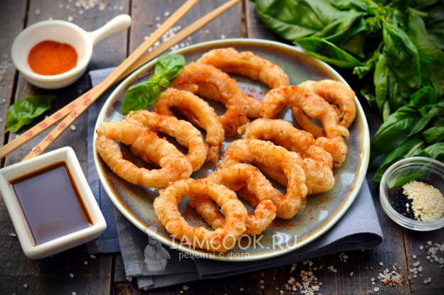 Кольца кальмаров в кляре по-китайски готовы к подаче на стол, дополните их любым соусом по вкусу, присыпьте паприкой.