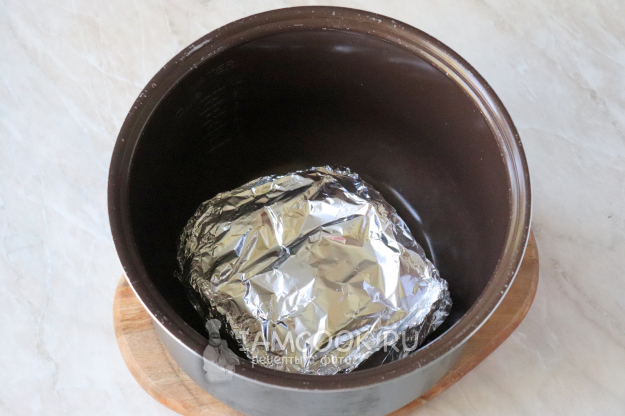 Получившуюся конструкцию отправить в чашу мультиварки. Закрыть крышку, выбрать режим "Выпечка" и нажать кнопку "Старт".