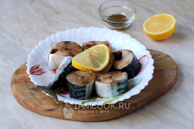 Разрезать скумбрию на порционные кусочки. Переложить их в миску, добавить специи, соевый соус и лимонный сок. Аккуратно перемешать.