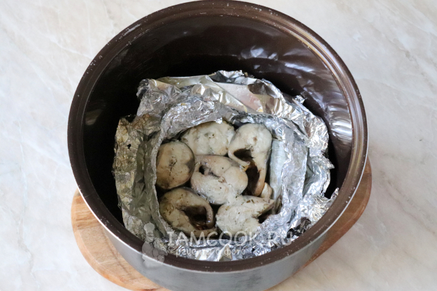 Запекать скумбрию в фольге в мультиварке 30 минут. По истечению времени рыба будет полностью готова. Сверху она останется светлой, а снизу, за счёт горячей чаши и соевого соуса, приобретёт румяную корочку.