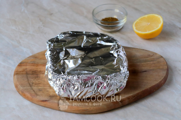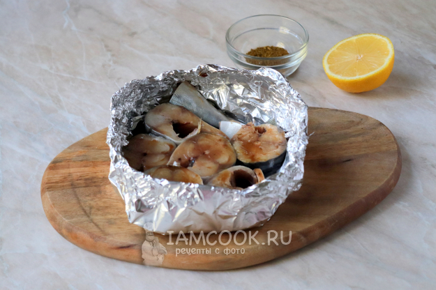 Из фольги, сложенной вдвое, сделать своеобразный контейнер, в который выложить рыбные кусочки и вылить оставшийся в миске маринад.