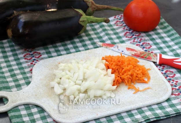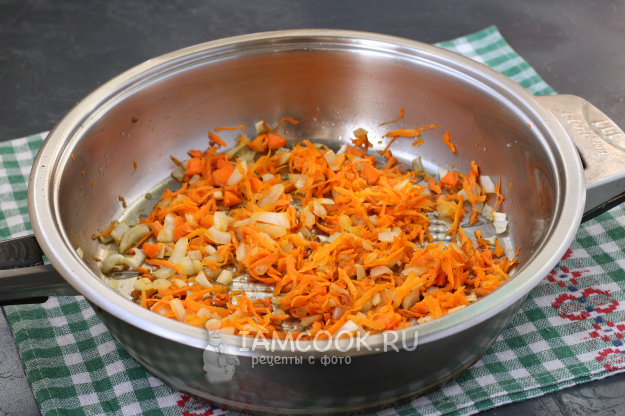 В сковороде разогреть 3 столовых ложки масла, обжарить лук с морковью до прозрачности лука.