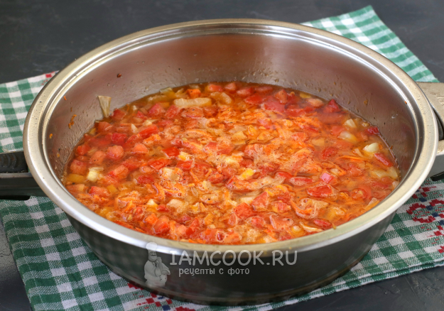 В оставшуюся зажарку добавить ещё пару ложек масла и измельчённый кубиками помидор, слегка обжарить и налить горячую воду из чайника. Довести до кипения, добавить соль и перец и тушить 5-7 минут.