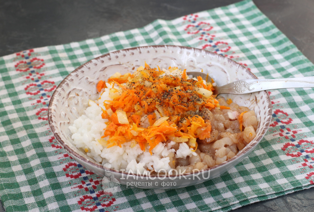 К рубленому куриному мясу добавить остывший рис и половину зажарки. Добавить соль и перец, хорошо перемешать. Фарш готов.