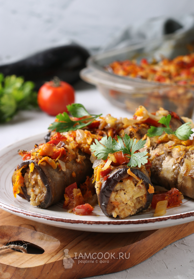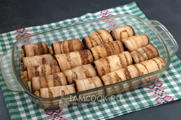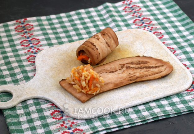 Пластины баклажанов выложить на бумажное полотенце и обсушить. На край пластины выкладывать понемногу подготовленного фарша и сворачивать в рулеты.