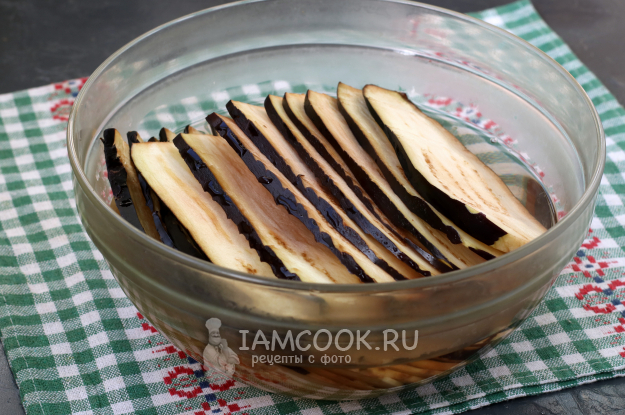 У баклажанов удалить плодоножку, нарезать их слайсами толщиной 3-4 мм. Сложить баклажаны в глубокую миску и залить кипятком на 10 минут. После этой процедуры пластины станут податливыми и будут легко скручиваться в рулеты.