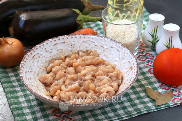 Для приготовления рулетиков из баклажанов с курицей и рисом подготовить из списка необходимые ингредиенты. Сразу промыть и поставить варить рис в кастрюле, хотя это можно сделать и заранее, чтобы рис успел остыть.