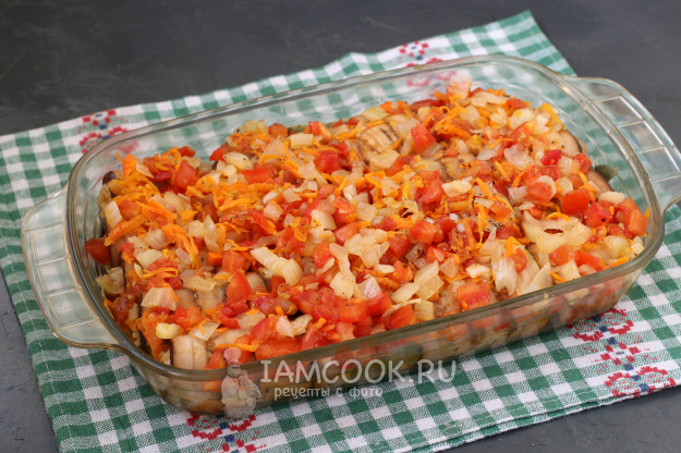 Сверху вылить овощную зажарку. Если вам кажется, что зажарки маловато, можно добавить в форму немного кипятка, около 50 мл. По бокам добавить лавровые листья.