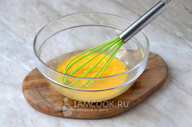 В отдельную миску вбить куриные яйца и разболтать их до однородности, используя вилку или венчик.