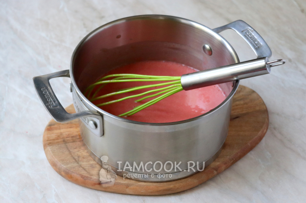 Затем тонкой струйкой, непрерывно помешивая, влить яичную массу в кастрюлю с ягодной основой.
