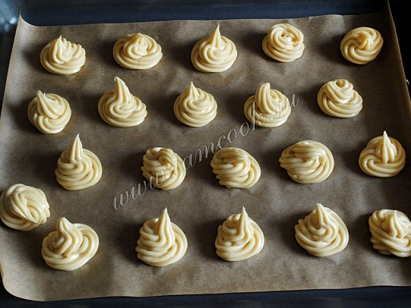 Готовое тесто выкладываем в кондитерский мешок. Застилаем противень пекарской бумагой и выдавливаем тесто с помощью насадки "маленькая звёздочка" с расстоянием 4-5 см друг от друга.